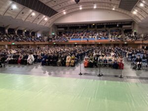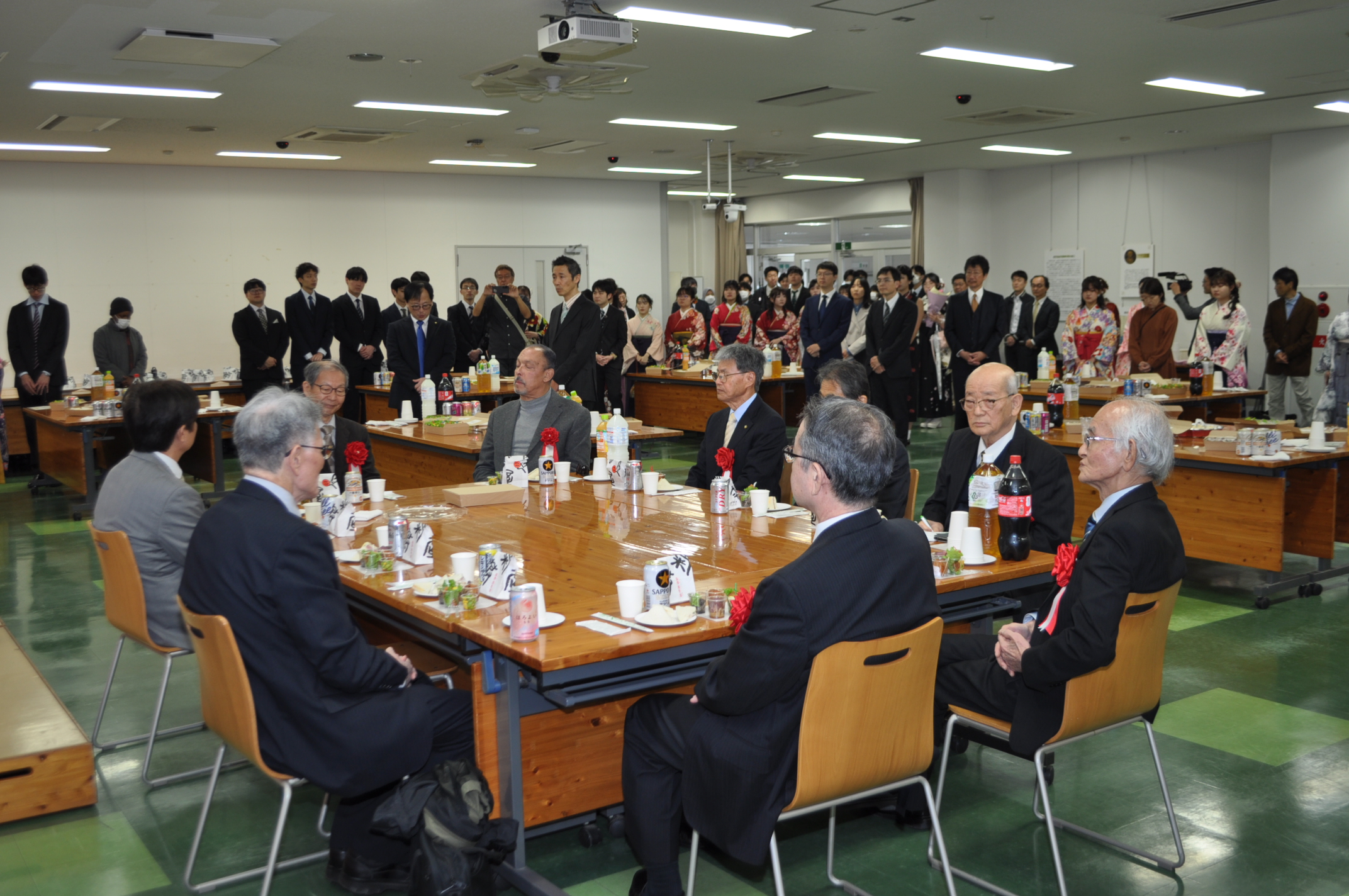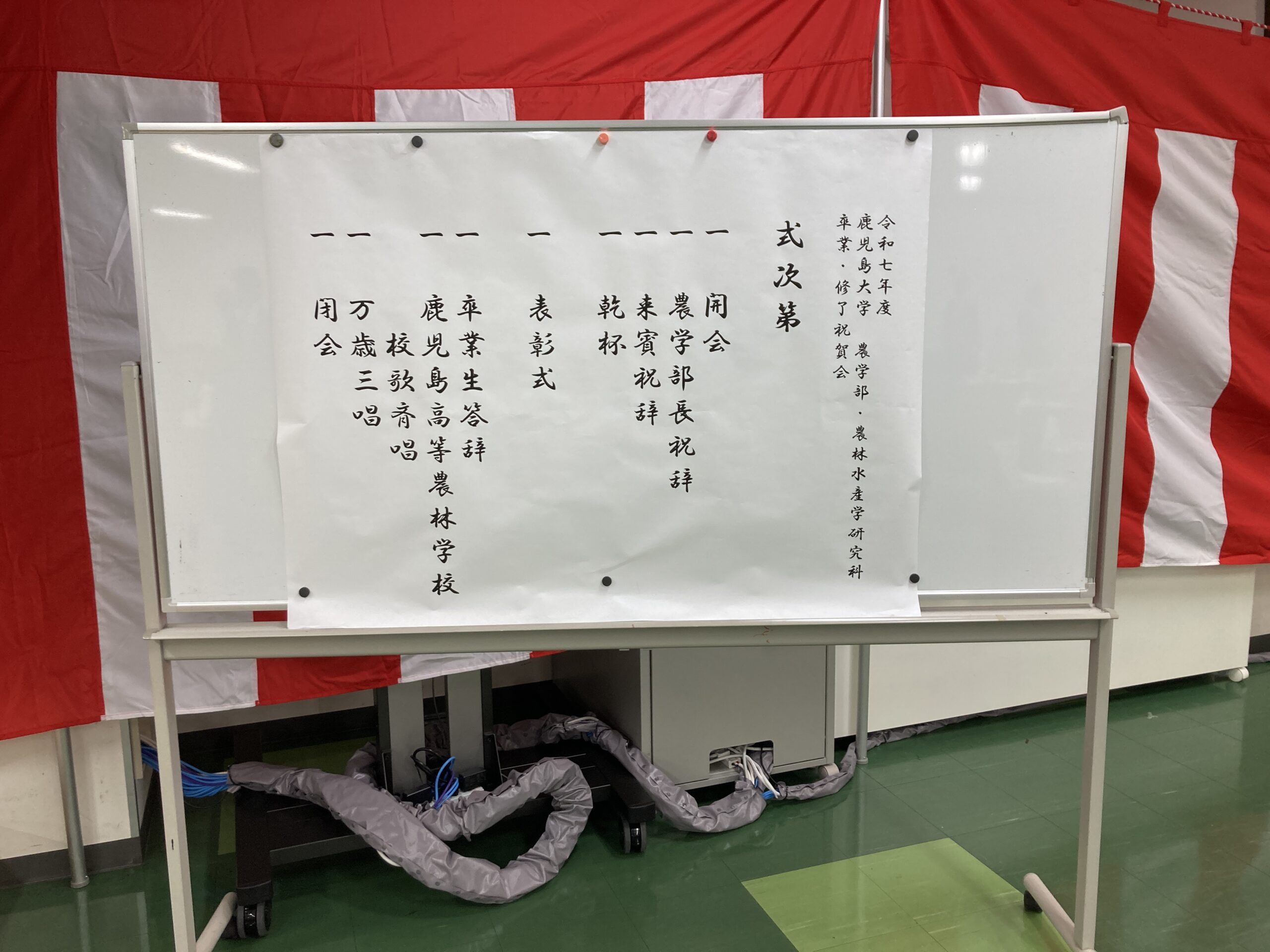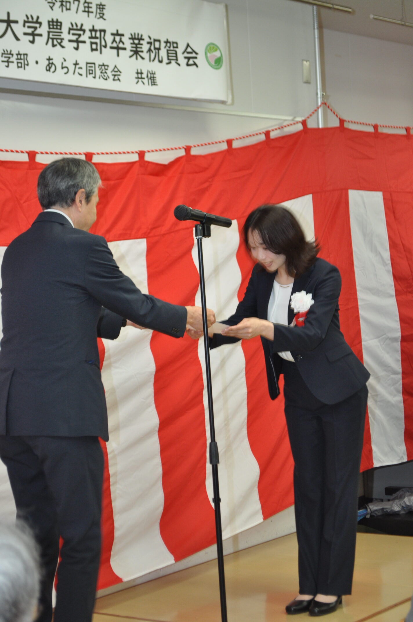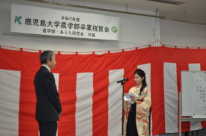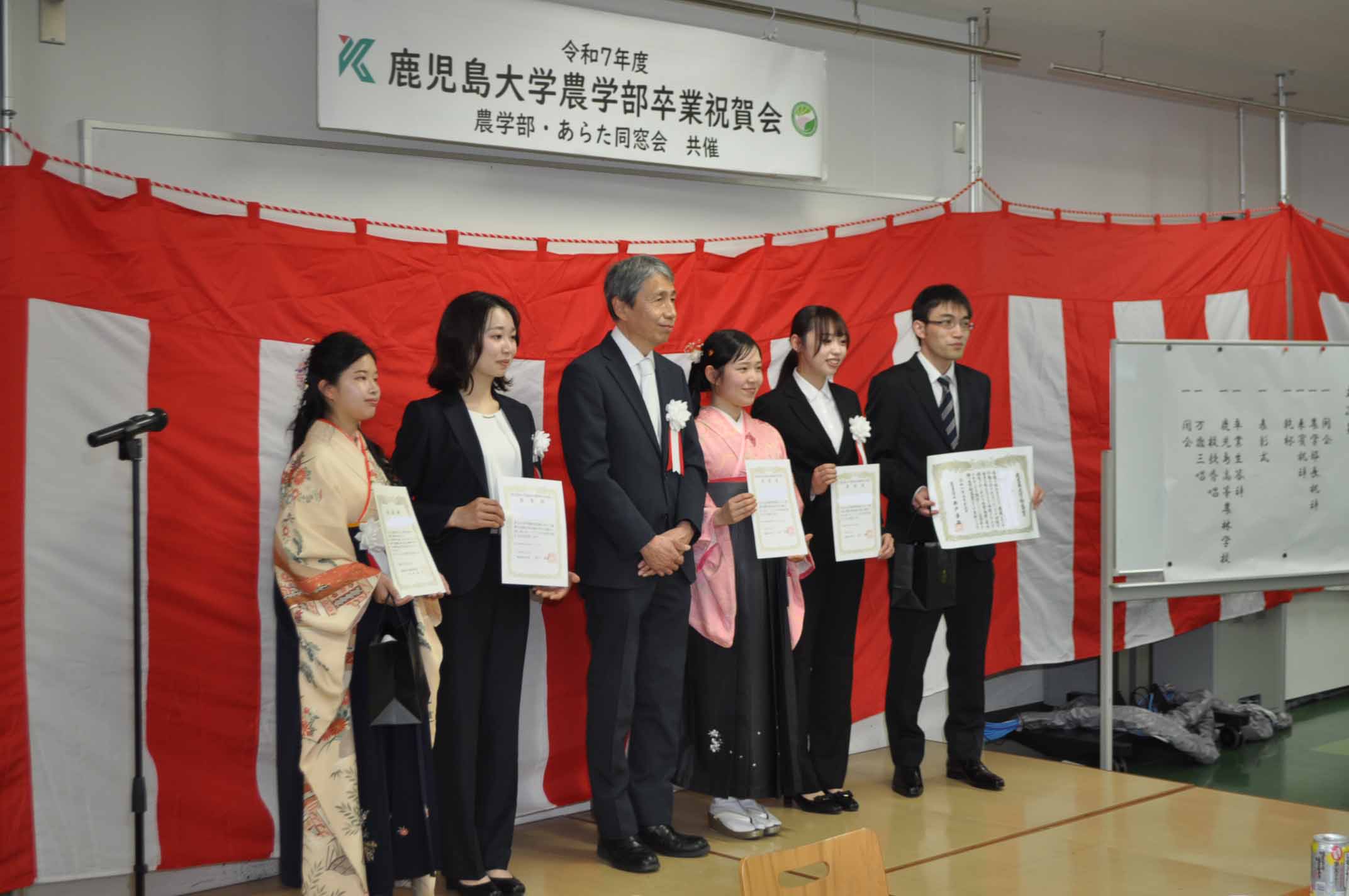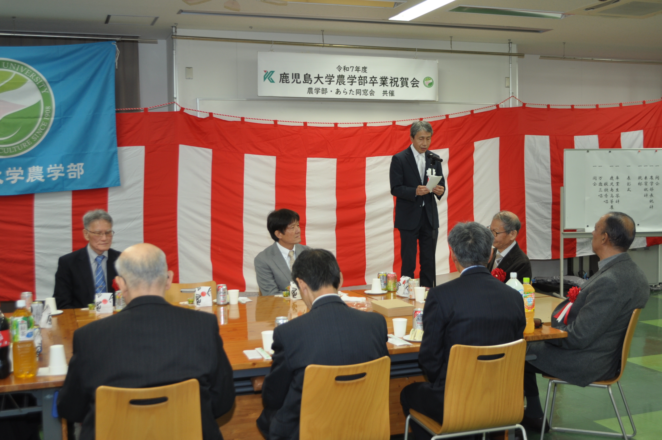 3月25日(水)、令和7年度(第74回)鹿児島大学卒業式・修了式が鹿児島県総合体育センター体育館において挙行されました。同日午後から農学部とあらた同窓会の共催により「農学部・農林水産学研究科(農学系)卒業・修了祝賀会」を農・獣医共通棟101号教室において盛大に開催しました。本年度の農学部卒業生は197名(うち改組後の農学科卒業生5名)、院(農学系)修了生は53名でした。(写真撮影 肥山 浩樹先生)