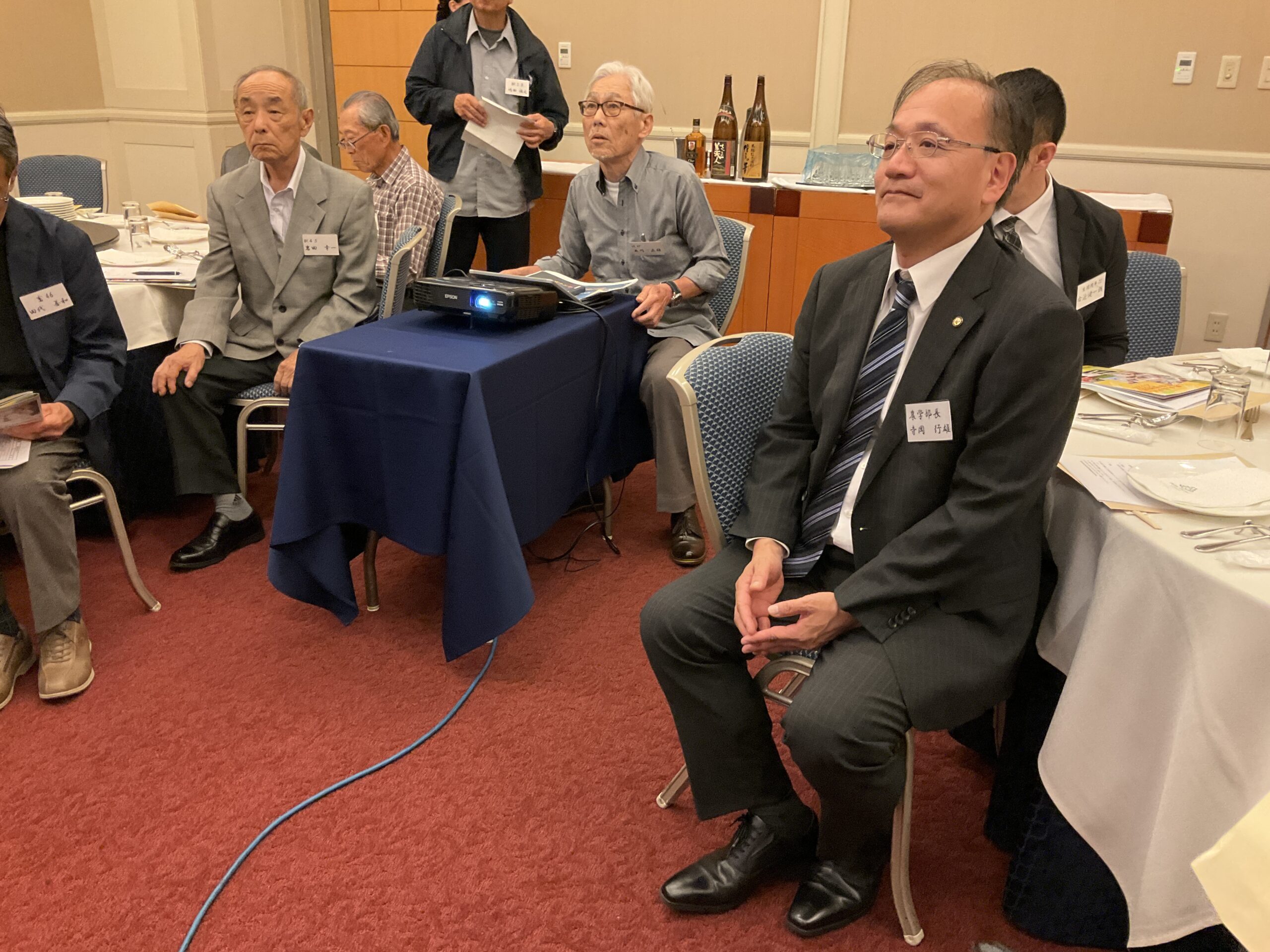 秋吉会長の開会挨拶の後、関西あらた会の運営に関する事項が提案され、承認されました。関西あらた会役員として、副会長には嶋田雅之氏(獣昭58)、常任幹事には瀬戸口恒夫氏(環平 7)が選出されました。なおその他の関西あらた会役員については、あらた同窓会HP(役員名簿)に掲載されていますので、ご覧ください。次いで来賓として出席いただきました農学部長寺岡行雄様より、母校・本部同窓会近況報告をしていただきました。