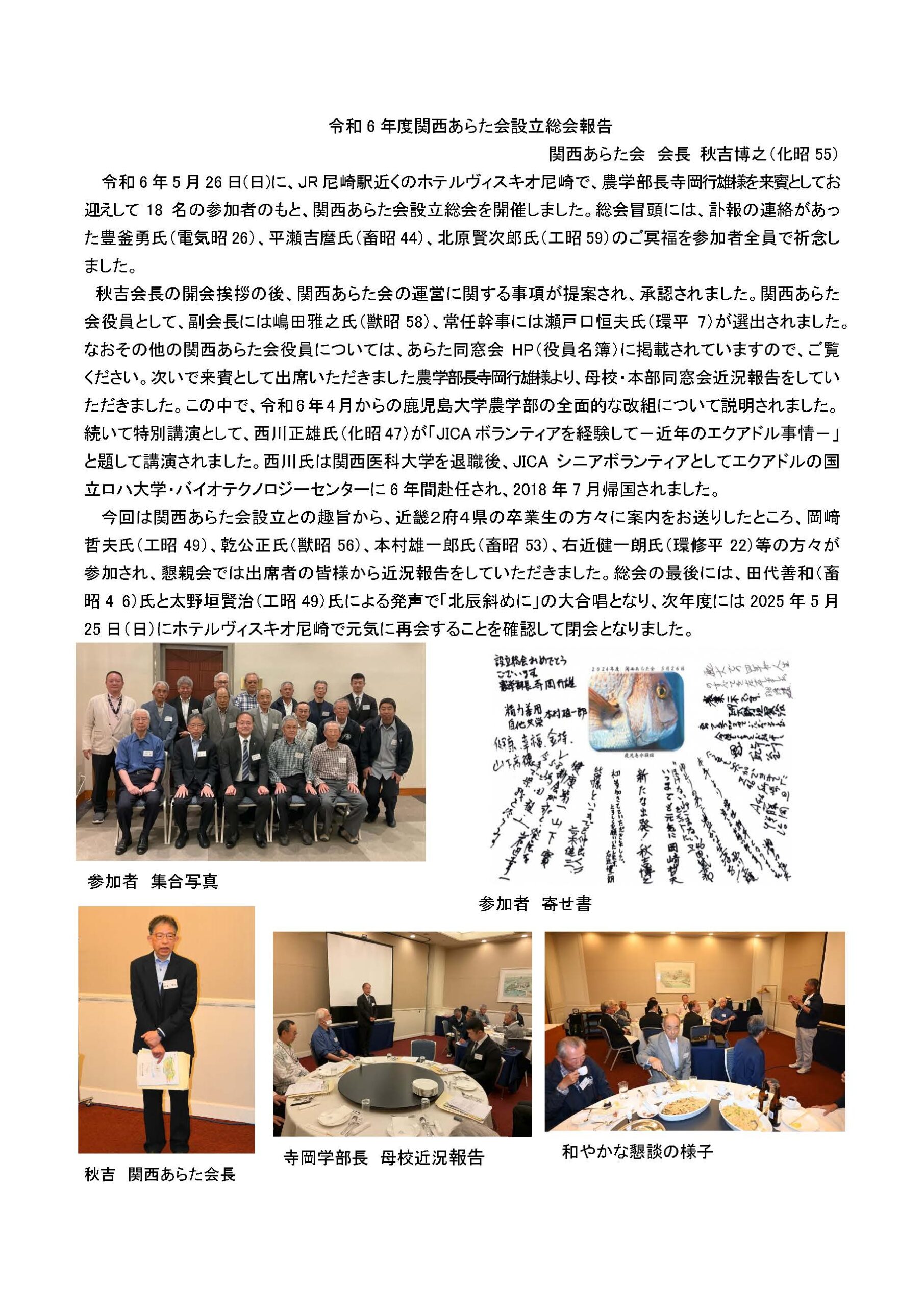 令和6年5月26日(日)に、JR尼崎駅近くのホテルヴィスキオ尼崎で、農学部長寺岡行雄様を来賓としてお迎えして18名の参加者のもと、関西あらた会設立総会を開催しました。