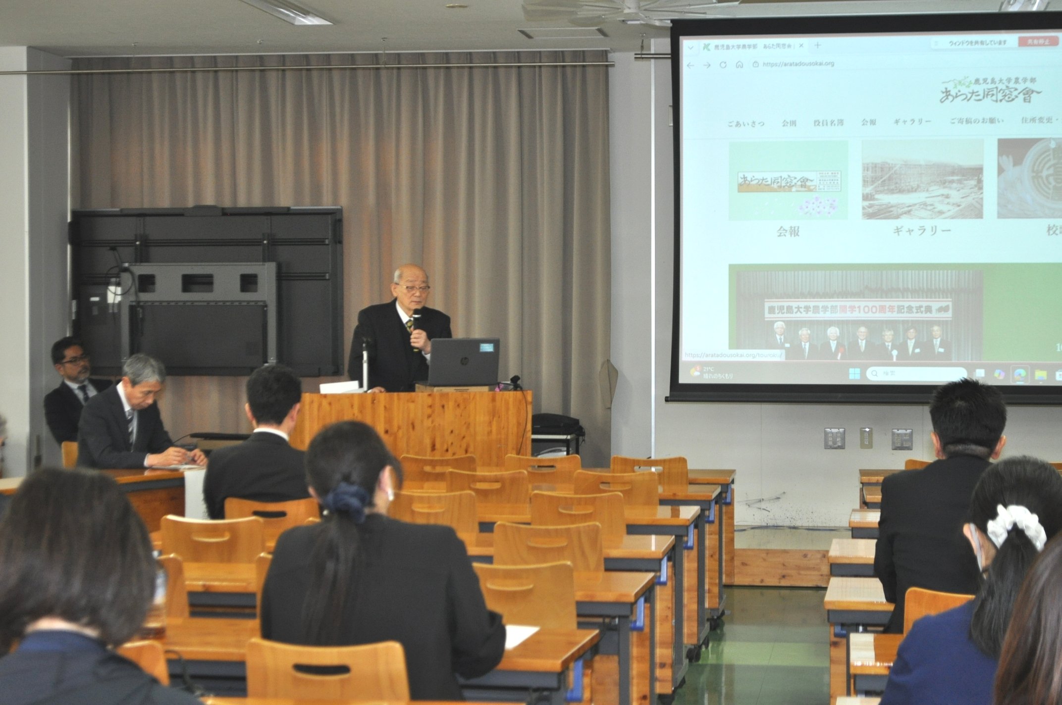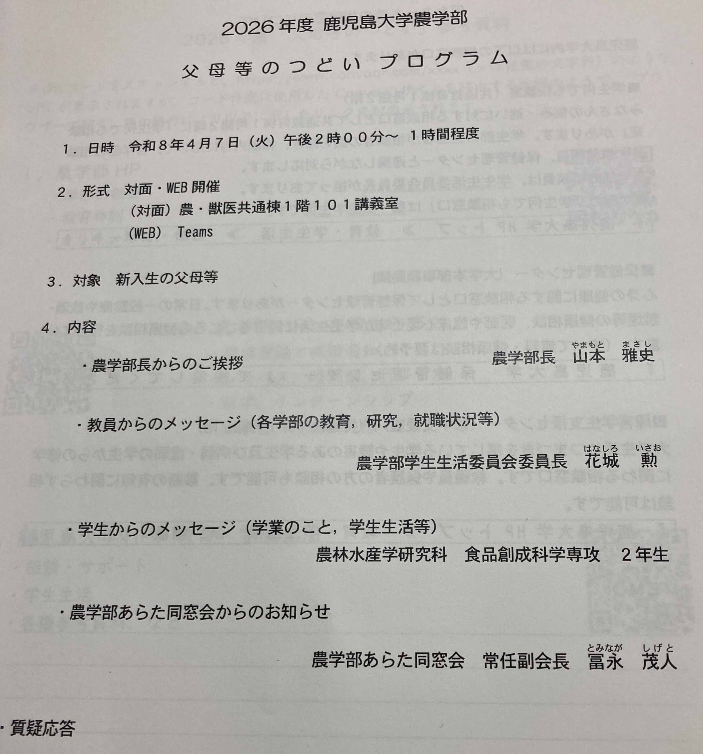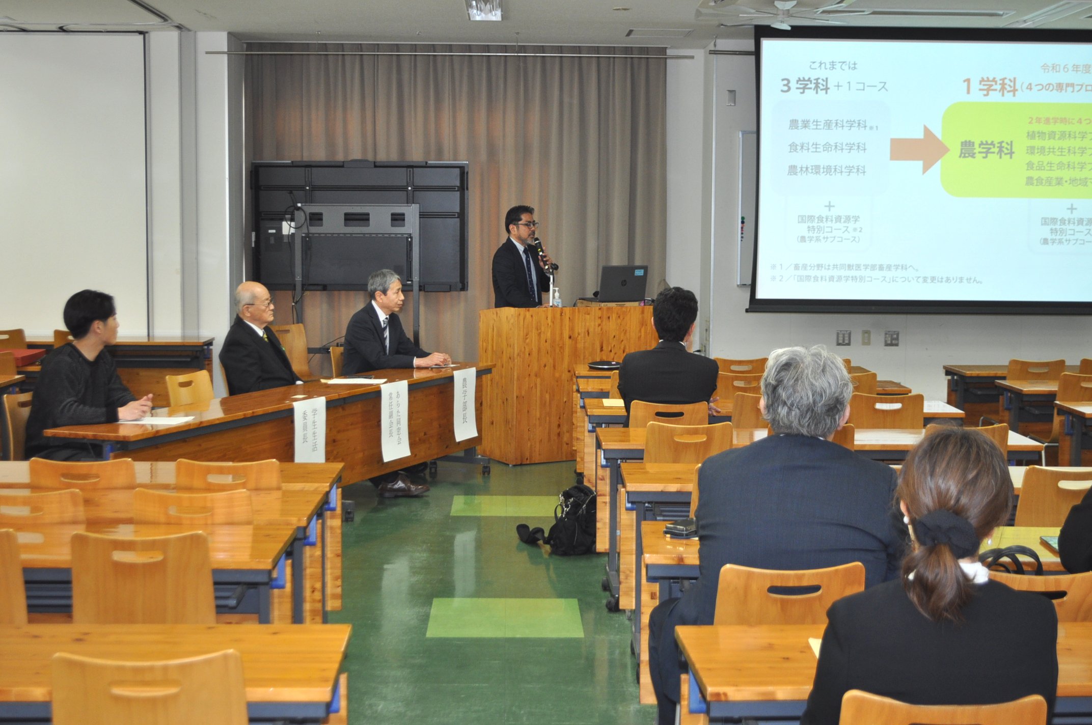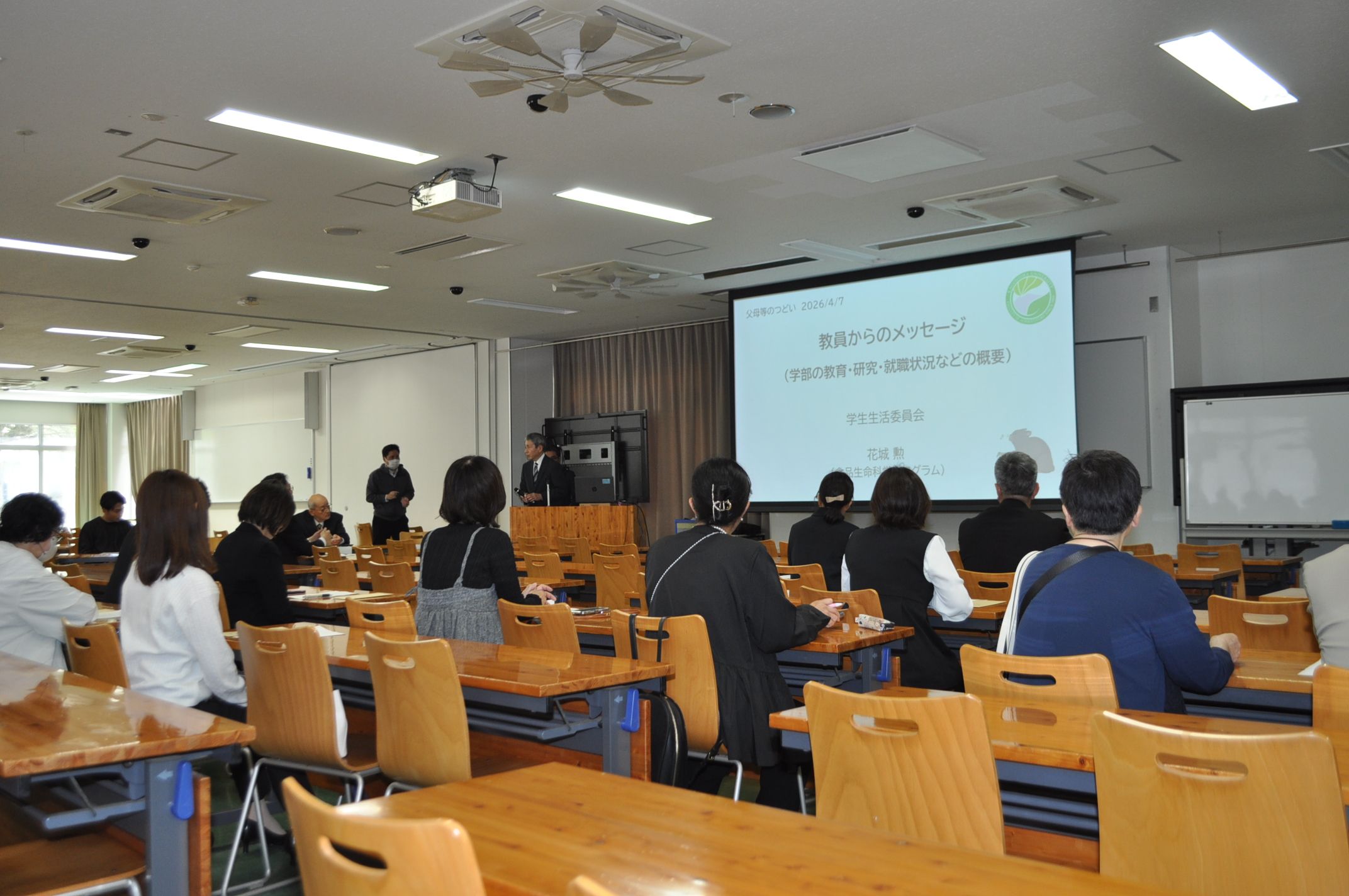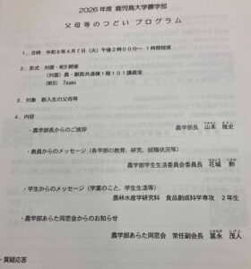 同日午後から農学部において「令和8年度新入生父母等のつどい」が開催されました。山本農学部長の挨拶の後、学部学生生活委員長による「農学部の学生生活や学業」についての説明および在学生からのメッセージがありました。